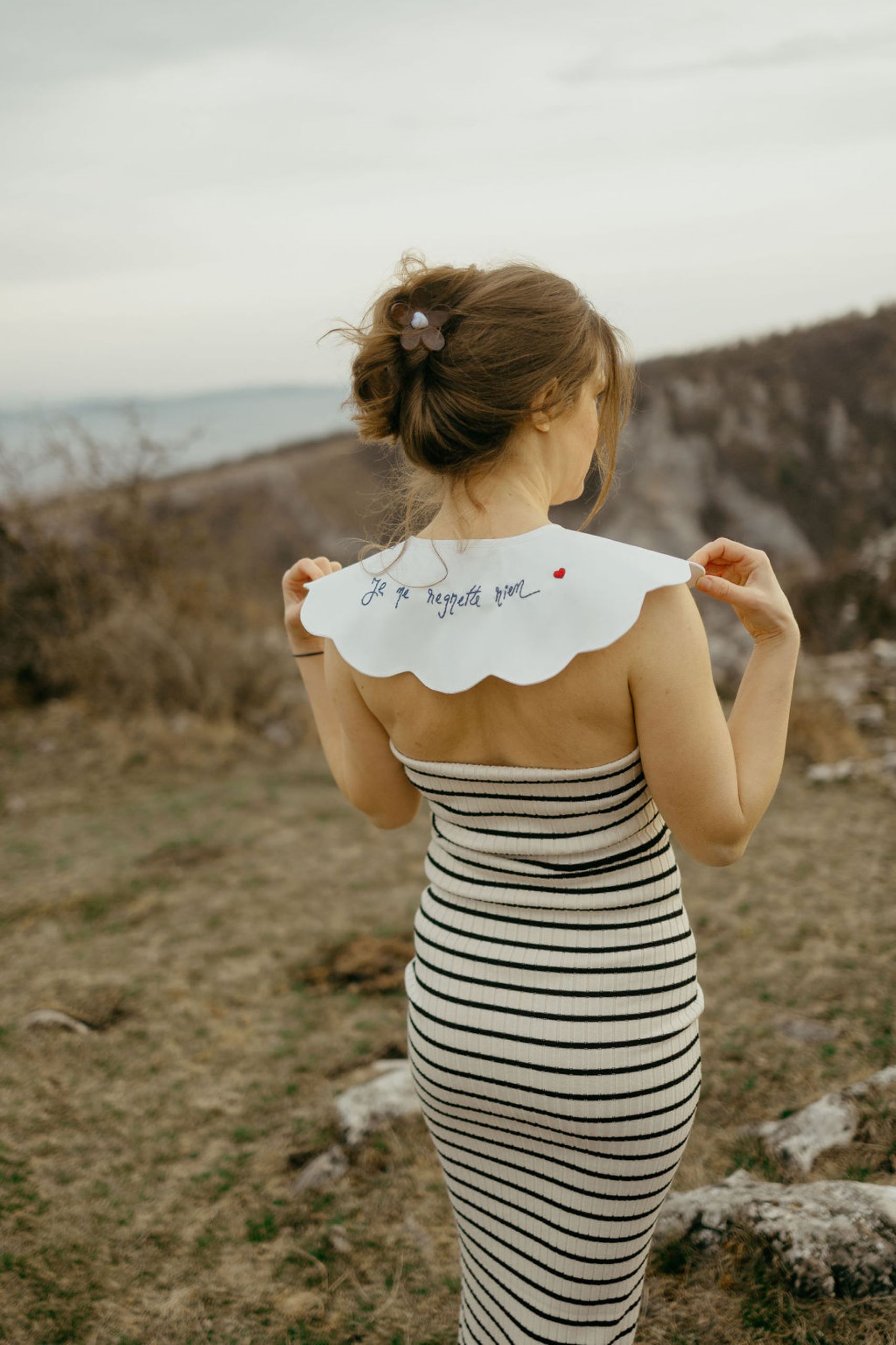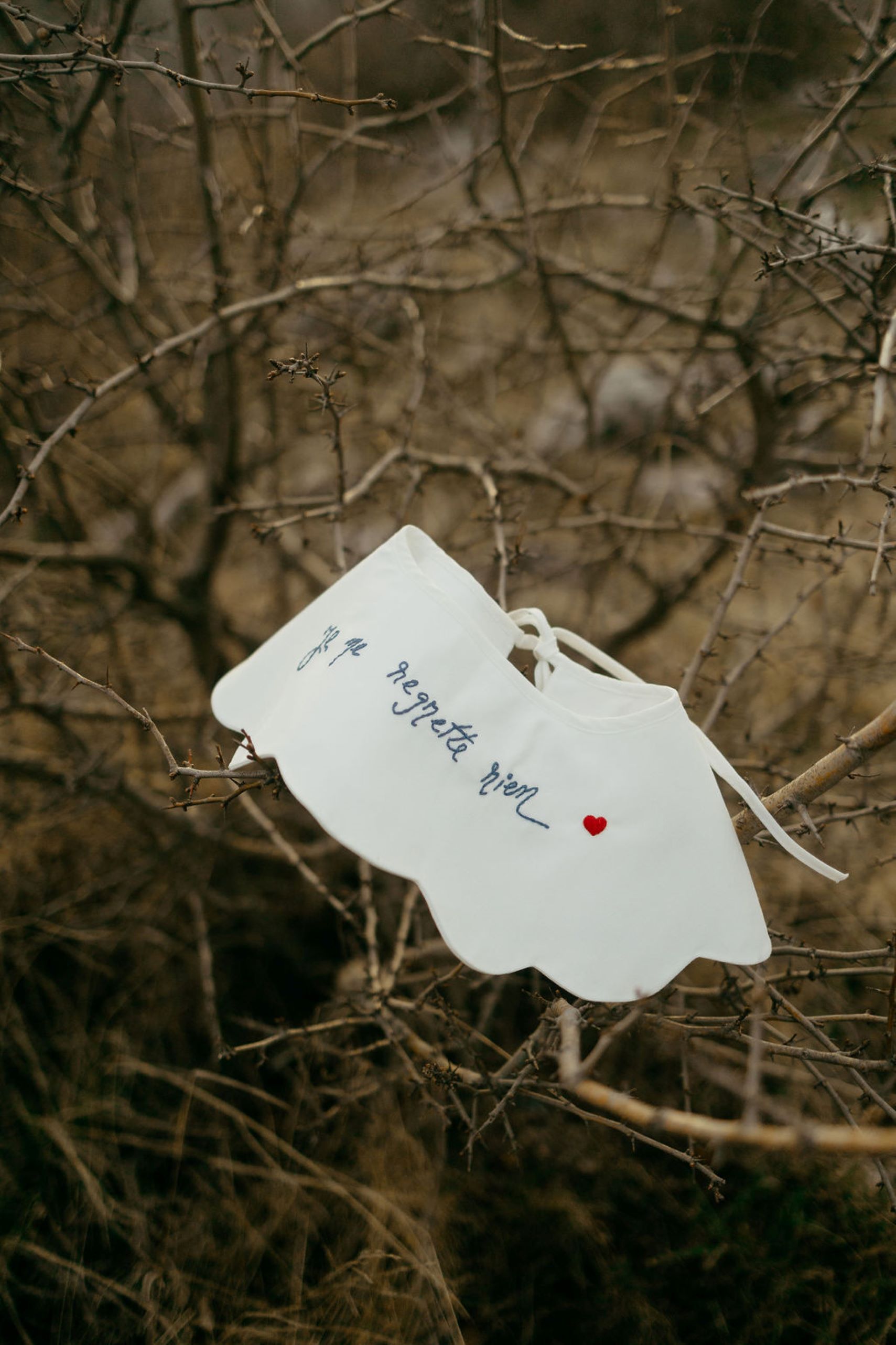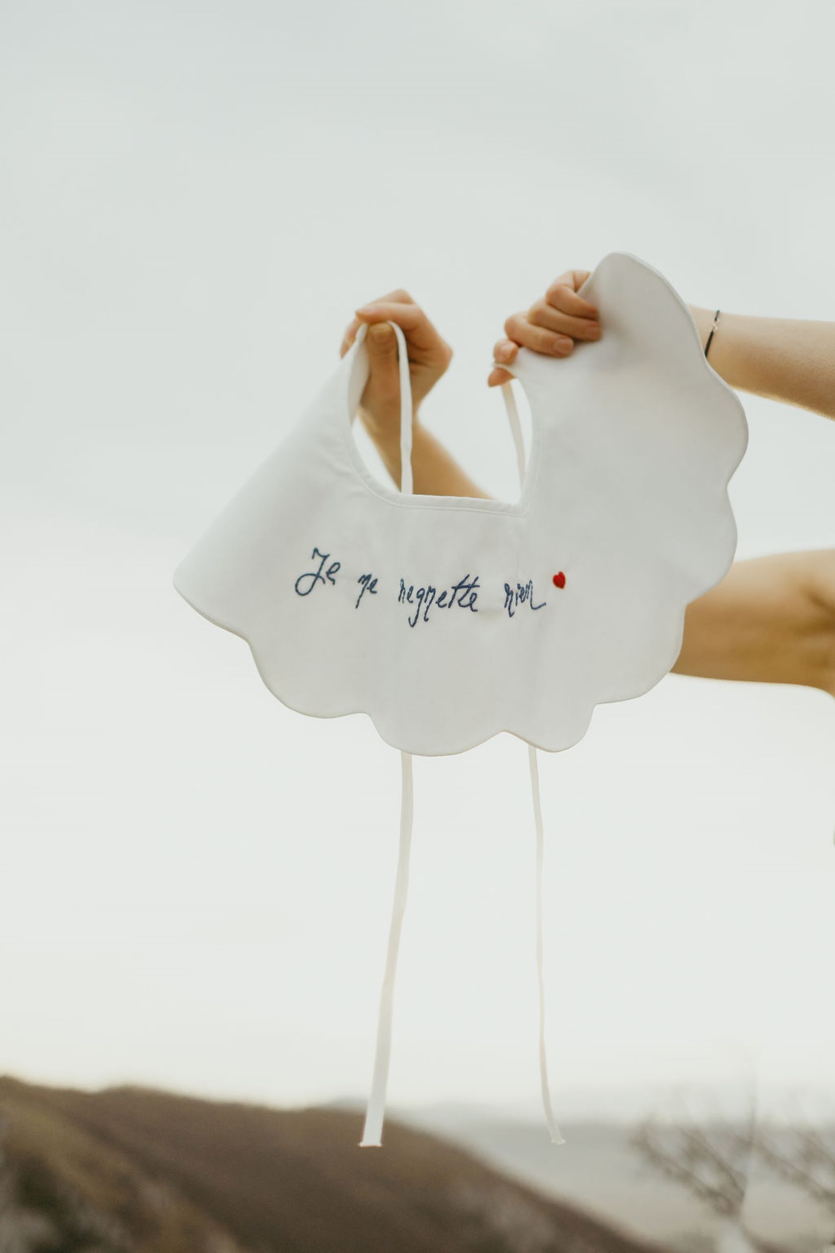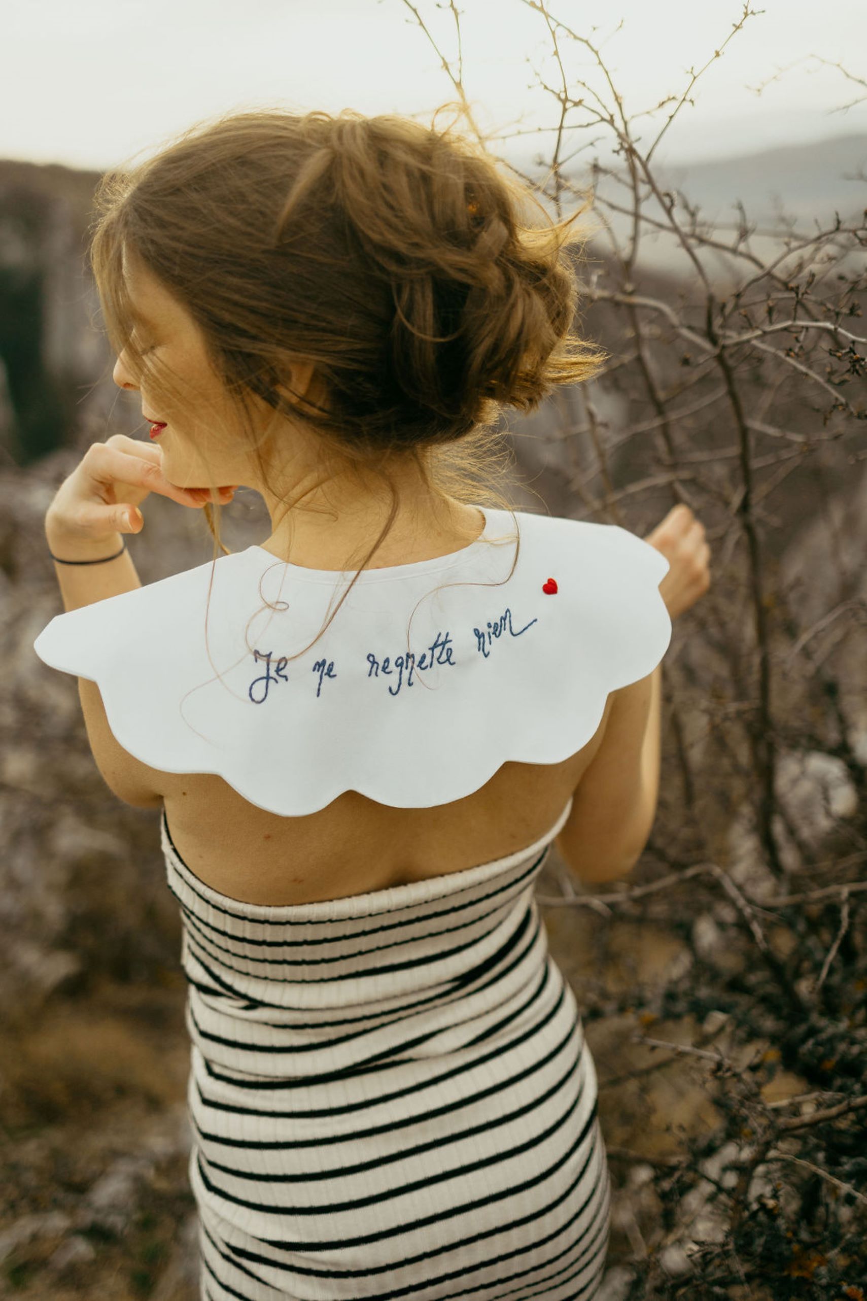 Sweet and feminime cotton white collar adorned with a hand embroidered french message “je ne regrette rien”.