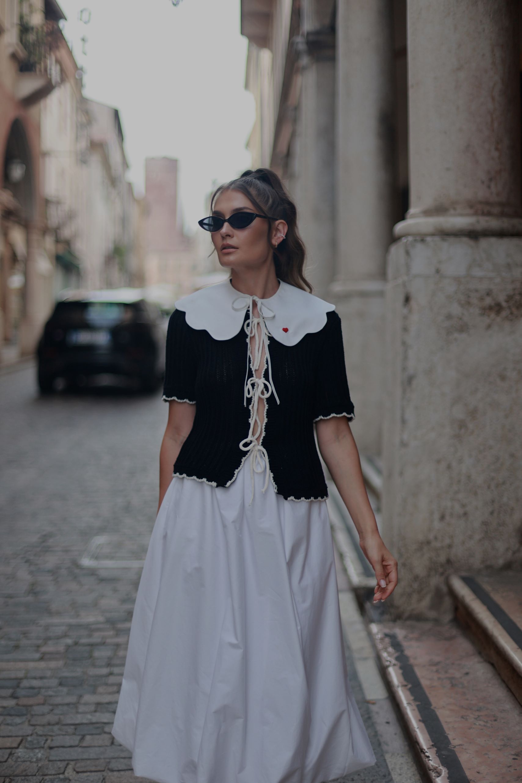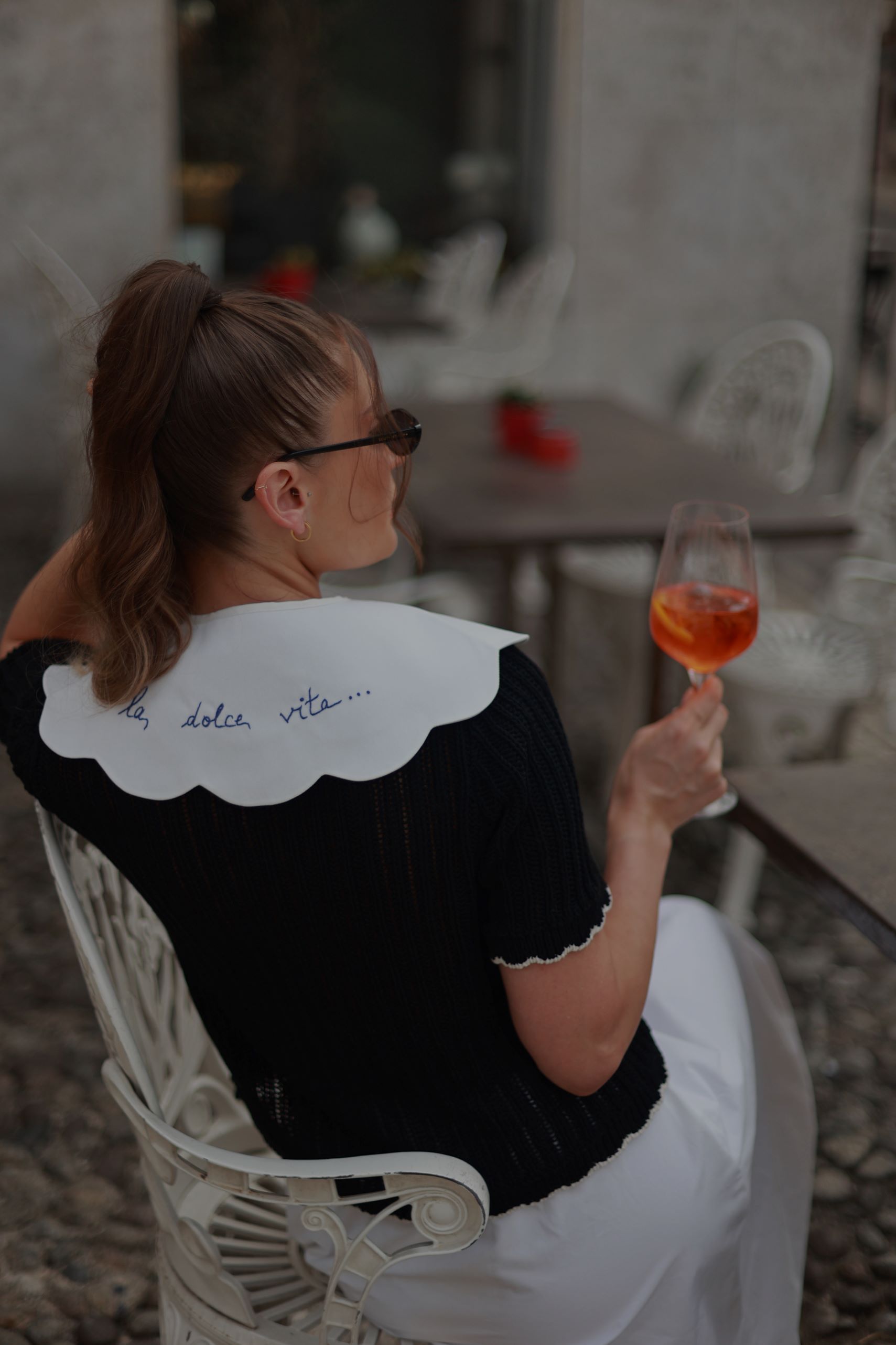 Sweet and feminime white collar adorned with a hand embroidered summer message “la dolce vita”.