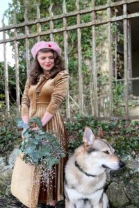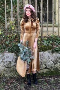 La robe! le velours nous rappelle déjà de la belle époque, du luxe et de l’aristocratie. La lavallière ça fait partie exactement de cette période.