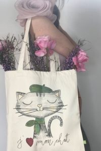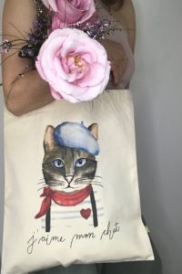 Pour cette collection j’ai travaillée toujours avec l’artiste peintre Ildiko Szabo. Ensemble on a conçu pour vous des illustrations joyeux avec des chiens, chats, portraits comme “la parisienne” fleurs, etc. Les images sont facile a porter et vont donner du style a votre tenue simple, classic. Egalement, je vous assure que sur la rue votre totebag attira tous les regards il a du peps. Moi j’avais sorti prendre un café avec le sac “J’aime mon chat” et le manager du café, une très sympatrique dame est tombée amoureuse de lui et j’ai le vendu directement.